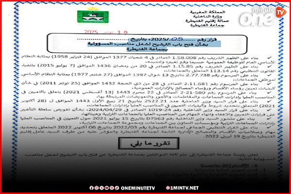 توصل موقع وان مينيت تيفي، من مصادر خاصة، بنسخة من قرار إداري يتعلق بفتح باب الترشيح لإحدى المباريات الداخلية بجماعة القنيطرة، وهو القرار الذي كان من المفترض، وفق المساطر المعمول بها، نشره عبر البوابة الرسمية للجماعة وإشعار جميع الموظفين المعنيين به في الآجال القانونية، قصد تمكينهم من الاستعداد وتكافؤ الفرص.