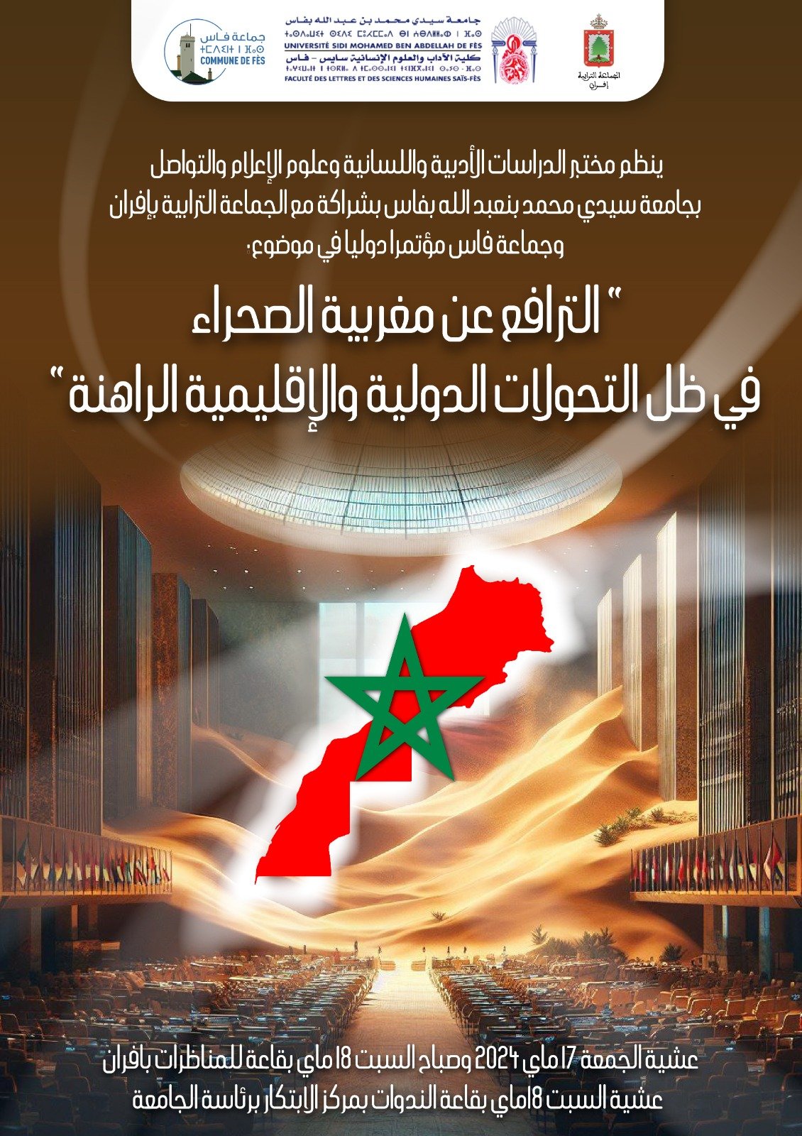 ينظم مختبر الدراسات الأدبية واللسانية وعلوم الإعلام والتواصل بكلية الآداب والعلوم الإنسانية فاس سايس التابعة لجامعة سيدي محمد بن عبد الله مؤتمرا دوليا في موضوع “الترافع عن مغربية الصحراء في ظل التحولات الإقليمية والدولية الراهنة يومي 17 و 18 ماي 2024 بالمركز الاصطيافي لقطاع الاتصال بإيموزار كندر وبمركز الابتكار برئاسة جامعة سيدي محمد بن عبد الله بفاس.