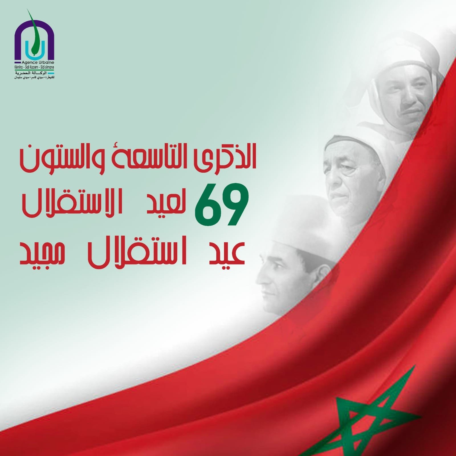 بمناسبة حلول الذكرى التاسعة والستين لعيد الاستقلال المجيد، التي تخلد ملحمة الكفاح الوطني من أجل الحرية واستعادة السيادة، وتجسد أسمى معاني التضحية والتلاحم بين العرش العلوي المجيد والشعب المغربي الوفي، تتشرف خديمة الأعتاب الشريفة السيدة ناهد حمتامي، مديرة الوكالة الحضرية القنيطرة-سيدي قاسم-سيدي سليمان، أصالة عن نفسها ونيابة عن كافة العاملين بهذه المؤسسة، بتقديم أصدق عبارات التهاني وأسمى المتمنيات إلى السدة العالية بالله صاحب الجلالة الملك محمد السادس نصره الله وأيده.